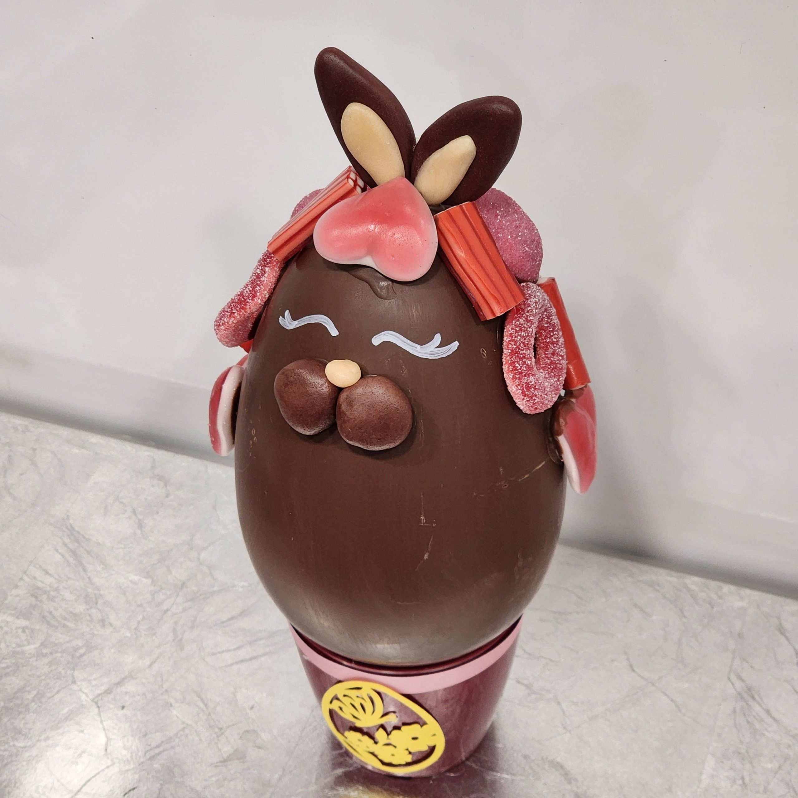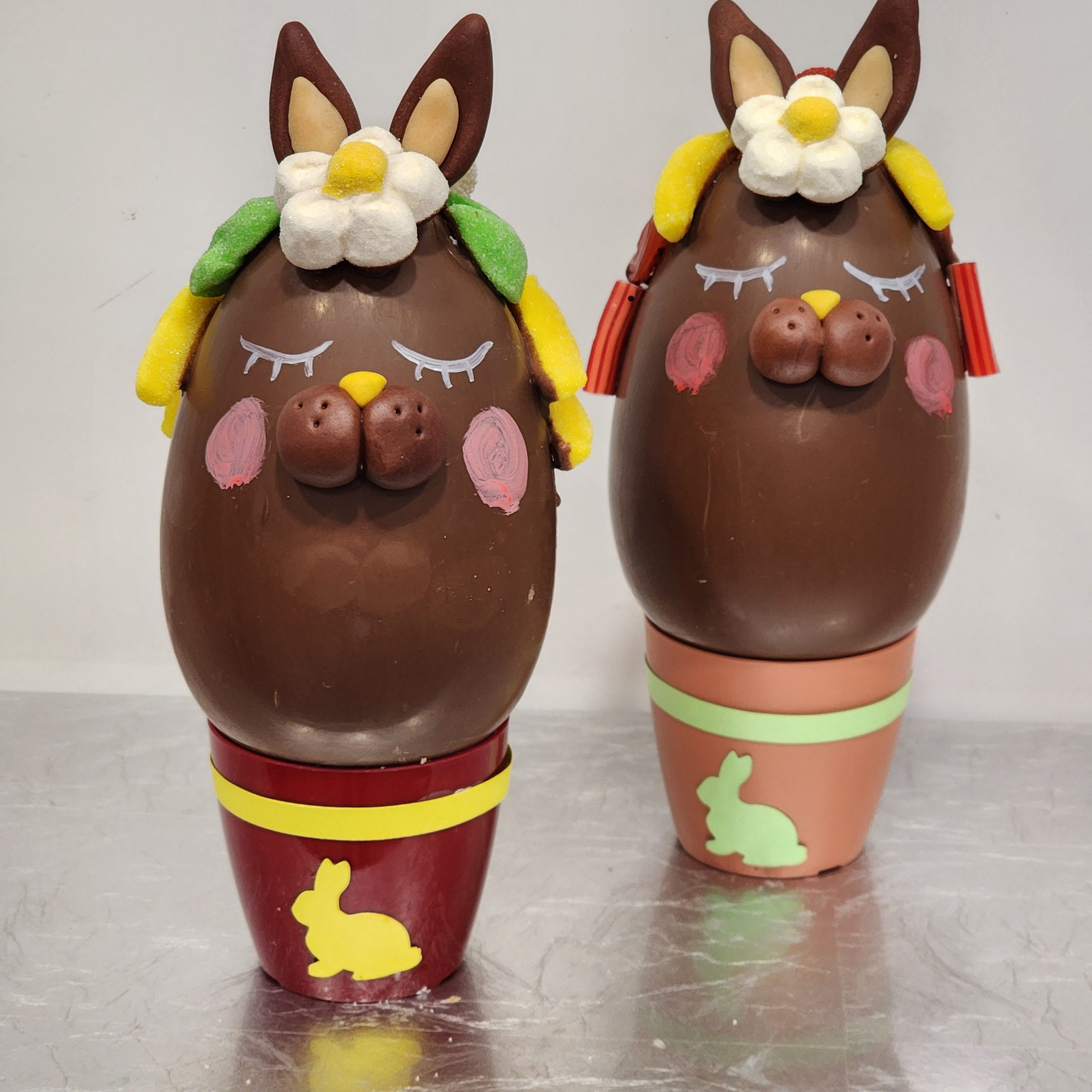 Huevos de chocolate con leche o blanco de 17 cm (pequeño) y 19 cm (grande) decorados con temática conejo.