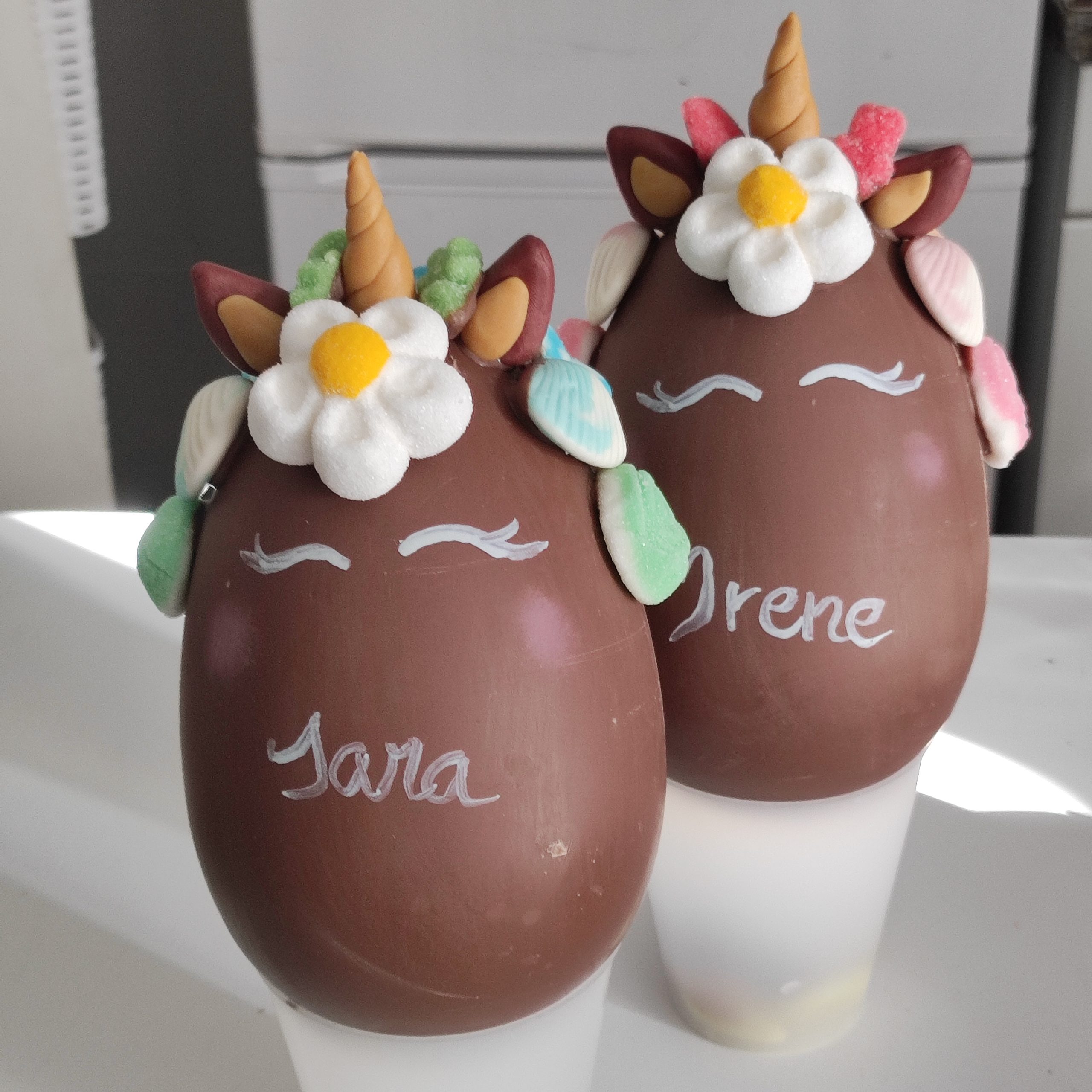 Huevos de chocolate blanco, con orejas y cuernito en fondant y pelo de gominolas. Relleno con sorpresa u otros dulces. Tamaño grande 17 cm, tamaño grande 20 cm