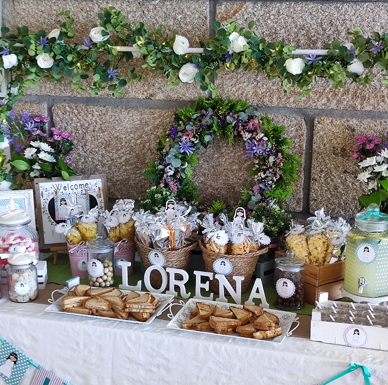 Mesa dulce para cualquier evento, en tonos verdes y fuxia. Especial celíacos (puede contener trazas) Conos variados con snacks salados y palomitas.