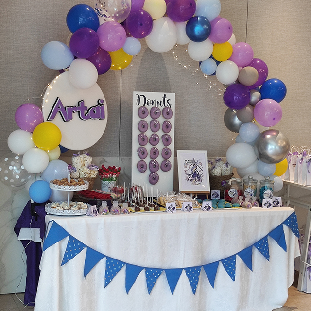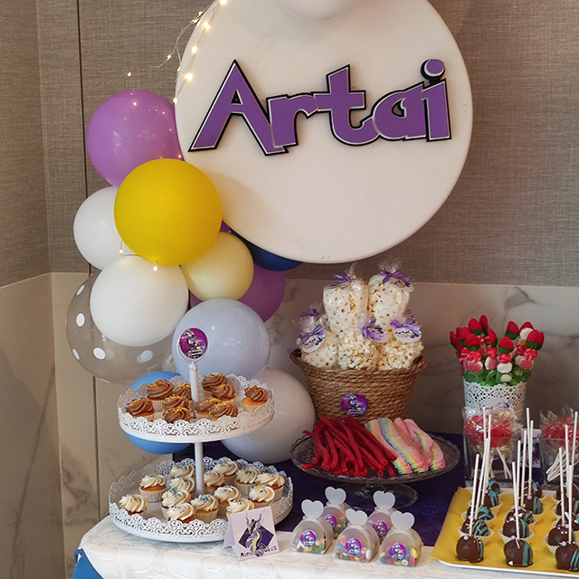 Mesa multitono y decoración temática mediante papeleria personalizada.