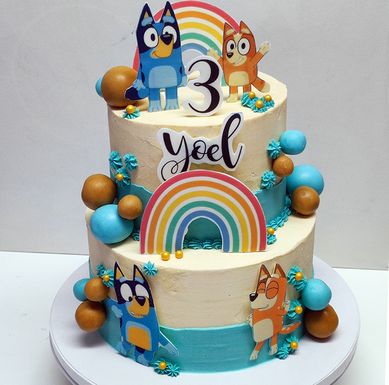 Tarta azul decorada con personajes de la serie Bluey. En la imagen 2 pisos, selecciona el tamaño según tus preferencias.